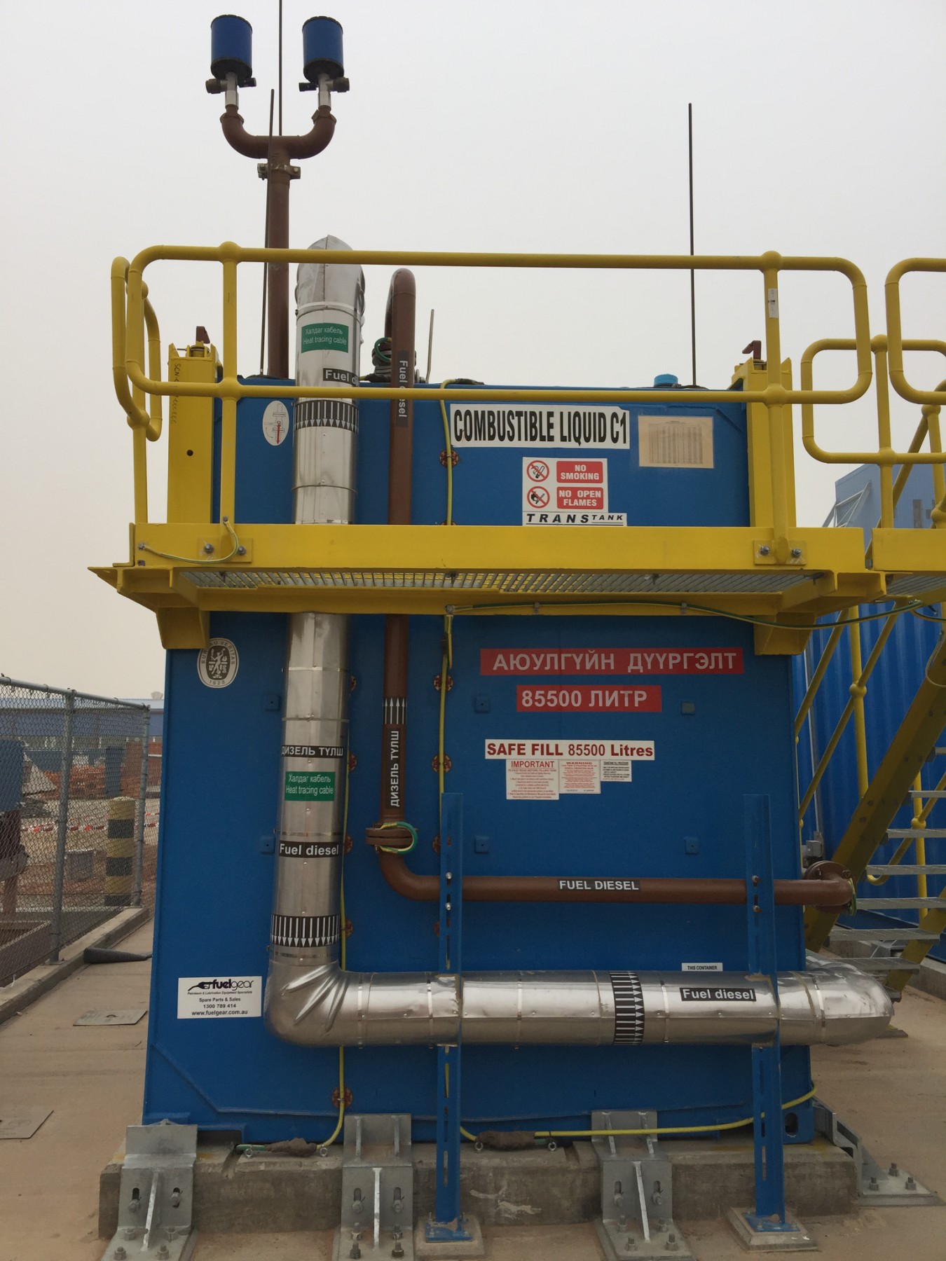 The Fuel Storage Area consists of an unbunded slab that falls across to the existing bunded lube storage area. This slab is supports the 90,000 L self-bunded fuel storage tank and the equipment enclosure which houses the batching tank and all of the pumps, filters, and instruments associated with fuel unloading and batching.